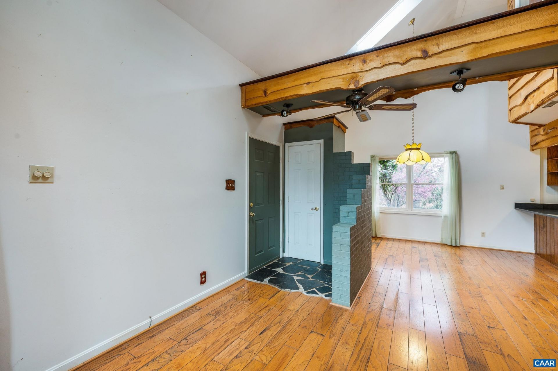 Escape to a home that perfectly blends rustic warmth with modern durability. This cozy 3BD 2BTH residence captures the essence of a woodland retreat, featuring low-maintenance shake vinyl siding that provides that classic cabin aesthetic without the upkeep. Step inside to an expansive open-concept living and dining area designed to impress. The cathedral ceilings create an airy atmosphere, while the rich exposed wood beams anchor the space, whether you are hosting guests or curling up by the fireplace. The exterior is a nature lovers dream. An oversized front porch serves as inviting space perfect for morning coffee or sunset relaxation. Meticulously maintained landscaping and beautiful gardens surround the home, offering seasonal color and privacy. The office has a separate entrance, allowing you to welcome clients or focus in total quiet without entering the main living quarters. The kennel has electricity , 2 separate runs, ideal for breeders, trainers or serious pet enthusiast.